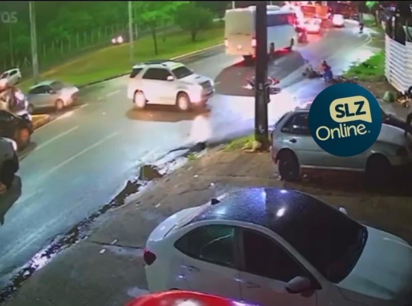 Nas imagens, é possível ver o momento em que o motociclista, que transportava uma mulher na garupa, faz o retorno, quando é atingido por outra moto que trafegava pela avenida.