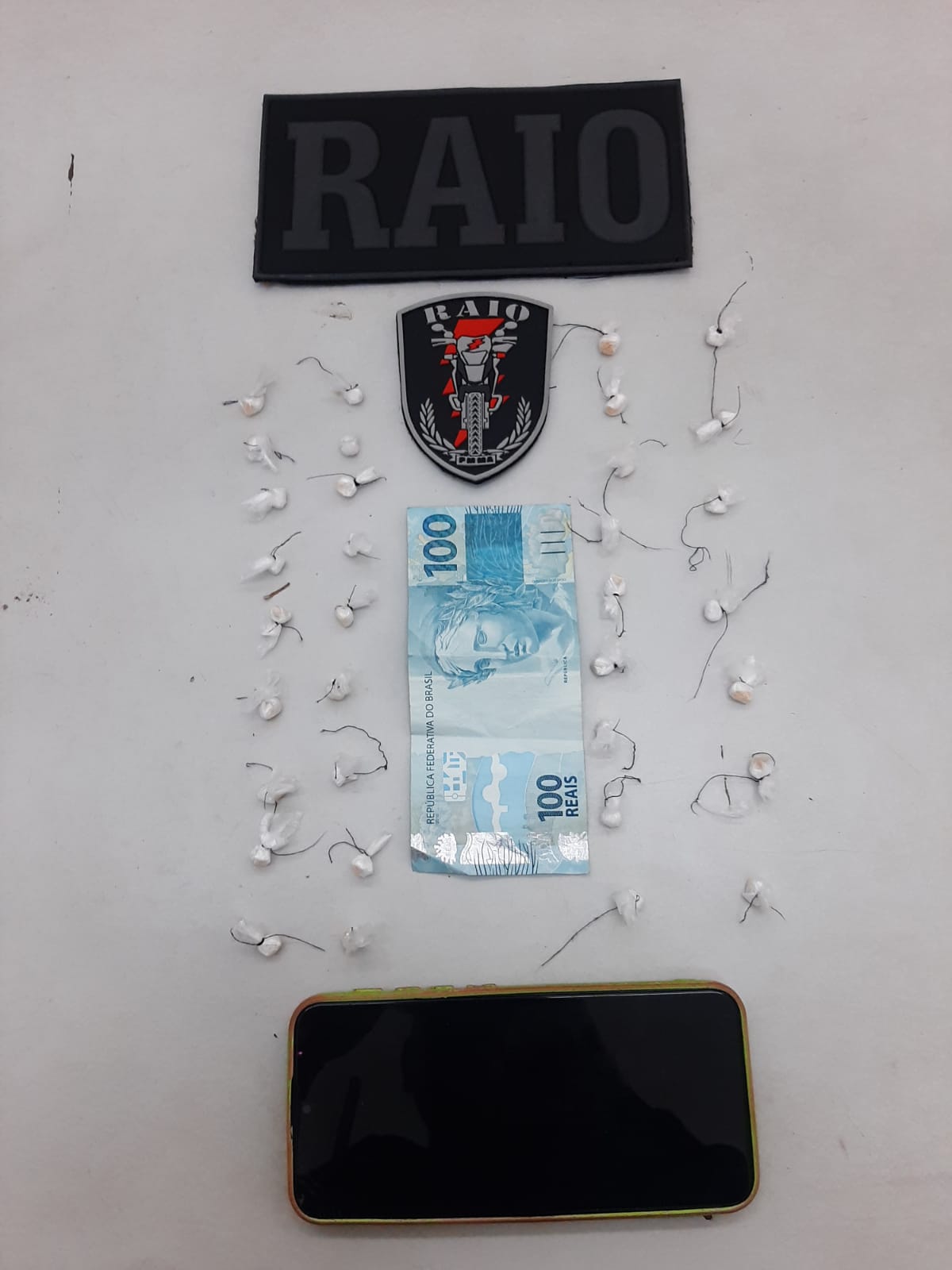 Ao ser abordado, foi encontrado um celular na sua cintura e, no bolso esquerdo do calção, uma quantidade de drogas semelhante a crack.