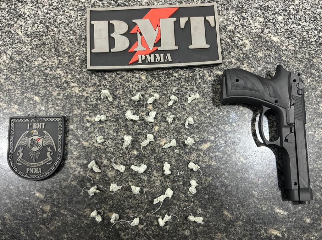Na noite desta quinta-feira (9), uma mulher foi detida pela polícia após esconder um simulacro de arma de fogo e drogas na cadeira de rodas de seu filho com deficiência física, na Avenida Vaticano, no bairro Fumacê, em São Luís.