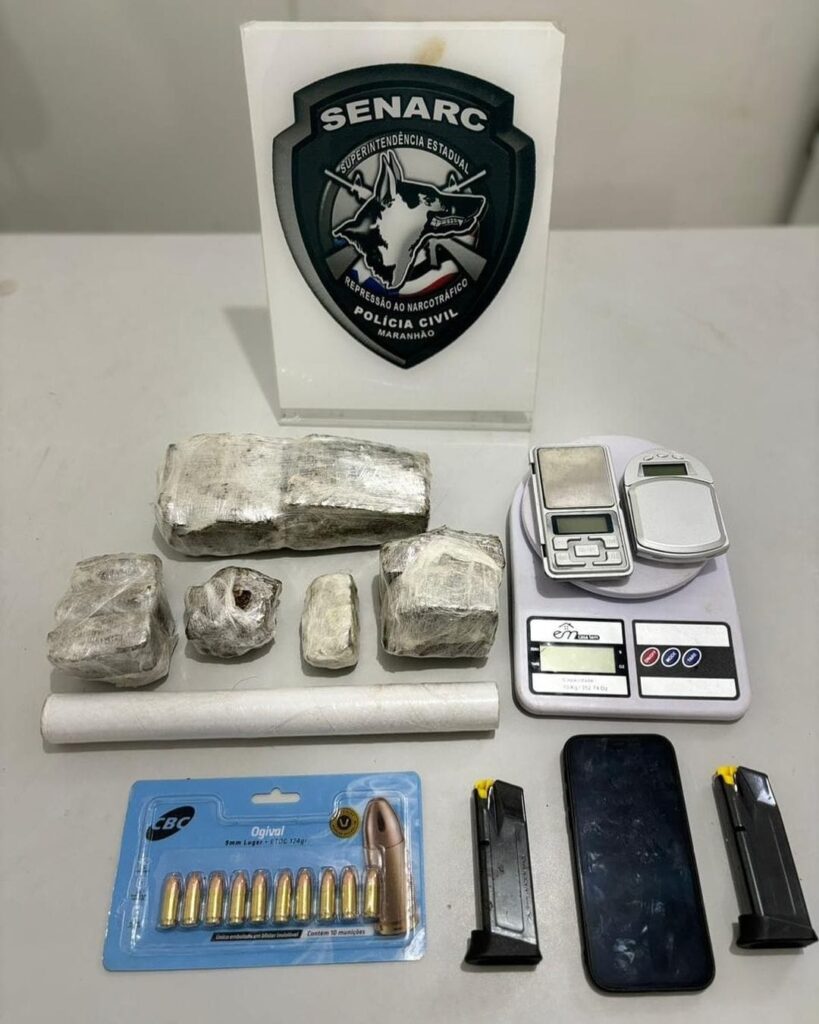 Em uma operação realizada nesta sexta-feira, 05 de julho, a Polícia Civil do Maranhão, por meio da Superintendência Estadual de Repressão ao Narcotráfico (SENARC), realizou uma importante apreensão no bairro Vinhais. Os agentes conseguiram confiscar aproximadamente 1 kg de Skunk, popularmente conhecida como “Super Maconha”, dois carregadores, 10 munições de calibre 9mm e três balanças de precisão.
